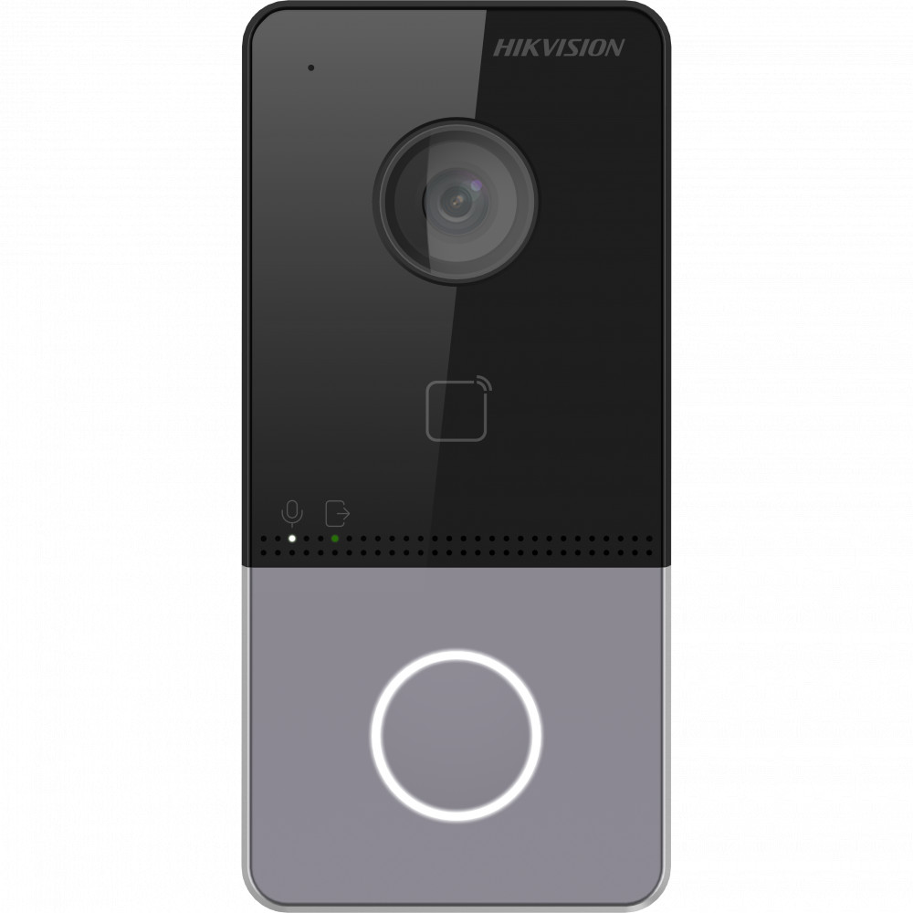 Kültéri egység műanyag házban, beépített kártyaolvasóval, IR-éjszakai megvilágítóval, beépített WiFi-vel, POE tápellátási lehetőséggel. Beltéri egység nélkül is tud az eszköz mobiltelefonokra jelezni a Hik-Connect alkalmazáson keresztül. Egyszerű konfigurációval, akár 32 felhasználó felé tudja elküldeni a hívást (push üzenet) és felvéve videó és hang kommunikációval tudunk beszélni a becsengetővel. Távolról a kaput is ki tudjuk nyitni, illetve bármikor kitekinthetünk a kamerán, ha nem csengetnek be, akkor is. A tápellátás lehet 12VDC tápegység (nem tartozék), vagy szabvány PoE switch (48V, nem tartozék)